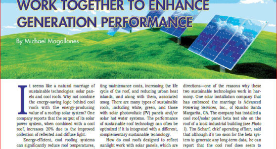 Cool Roofs and Photovoltaics Work Together to Enhance Generation Performance May 15, 2011 It seems like a natural marriage of sustainable technologies: solar panels and cool roofs. Why not combine the energy-saving logic behind cool roofs with the energy-producing value of a rooftop… Technical Article