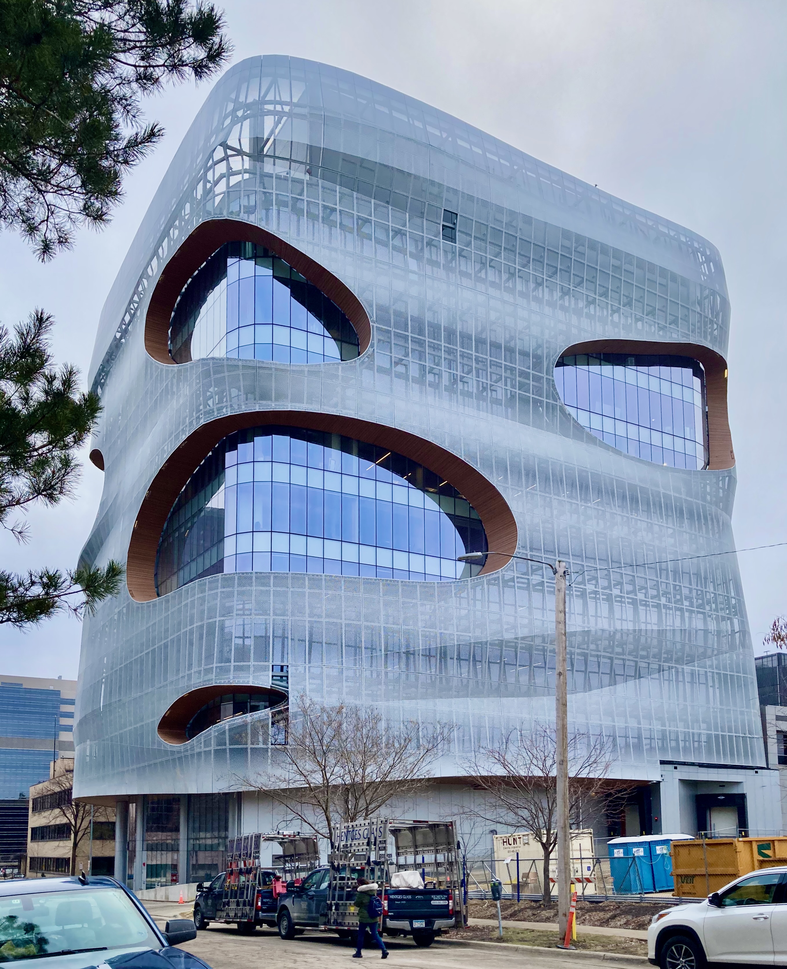 Scope: Lerch Bates was integrated into the project team due to the risk inherent into achiving aspirational aesthetic goals of the project and Lerch Bates proven experience with architecturally driven designs and ensuring functionality of the building as a research facility. During design Lerch Bates assisted HDR in translating their three renderings into constructible building enclosure systems and determining with the construction team enclosure budgets assigned to each concept. Upon final selection by Mayo Clinic of the project direction, Lerch Bates worked with HDR and Knutson Construction to develop the specification performance targets and performance mockup protocols, formulate the delegated design RFP, and provided technical feedback of potential trade partner approach through the selection process. After a delegated design trade partner was selected, Lerch Bates worked to integrate the partner facade systems with the design aesthetic by collaborating on assembly approaches while still achieving enclosure performance requirements. Through the process, Lerch Bates guided detail coordination between trade partners and enclosure assemblies with the unitized curtain wall assembly, which culminated in highly integrated shop drawings and submittals which addressed extreme cold weather conditions experienced in Minnesota. During construction Lerch Bates' site observations were critical in identifying non-compliant assemblies and through self-performing AAMA 501.2 and AAMA 503 testing, confidence was provided to the construction and Mayo Clinic team that the facade systems were integrated in accordance with Contract Documents, manufacturer requirements, and industry best practices.