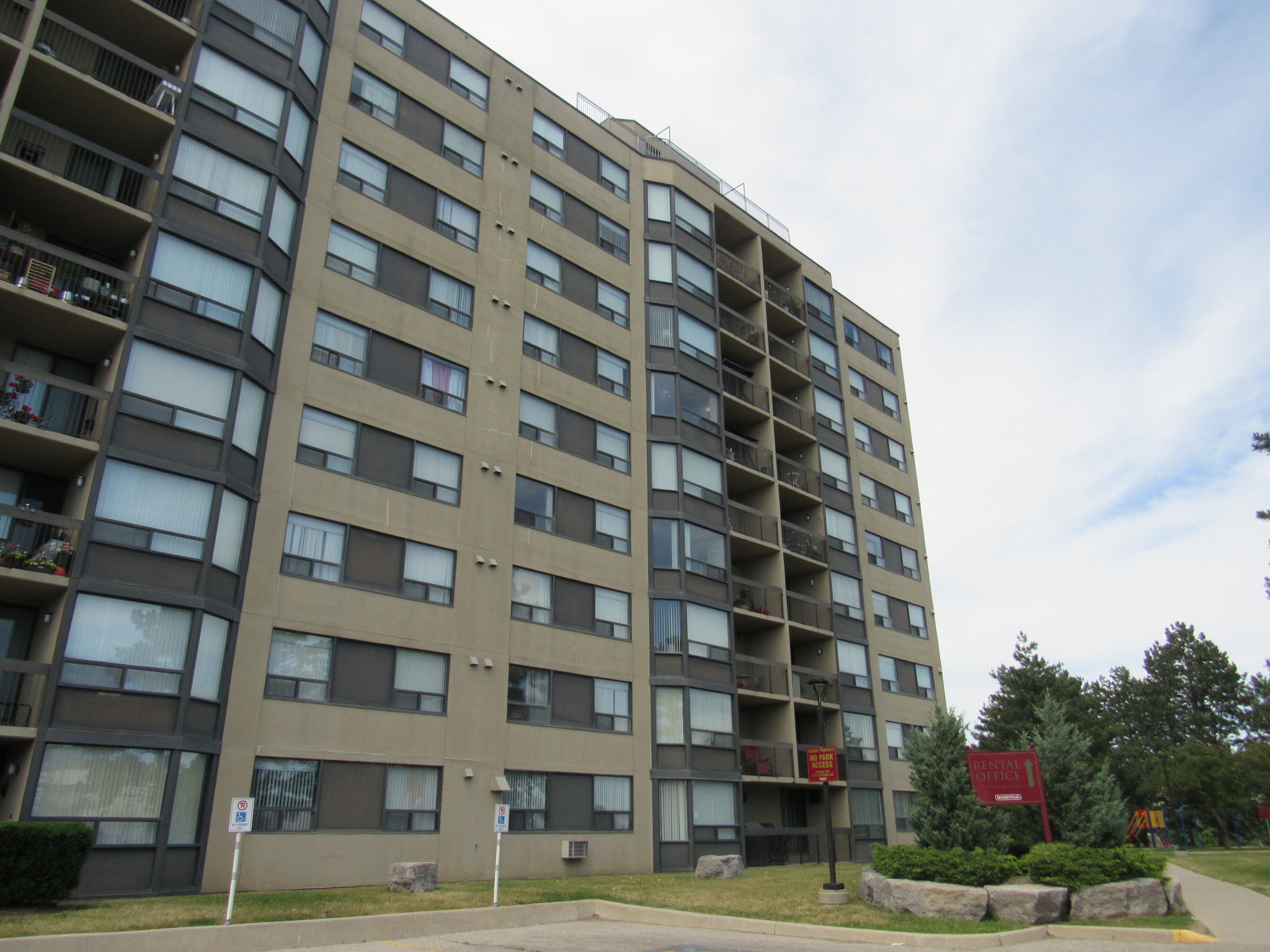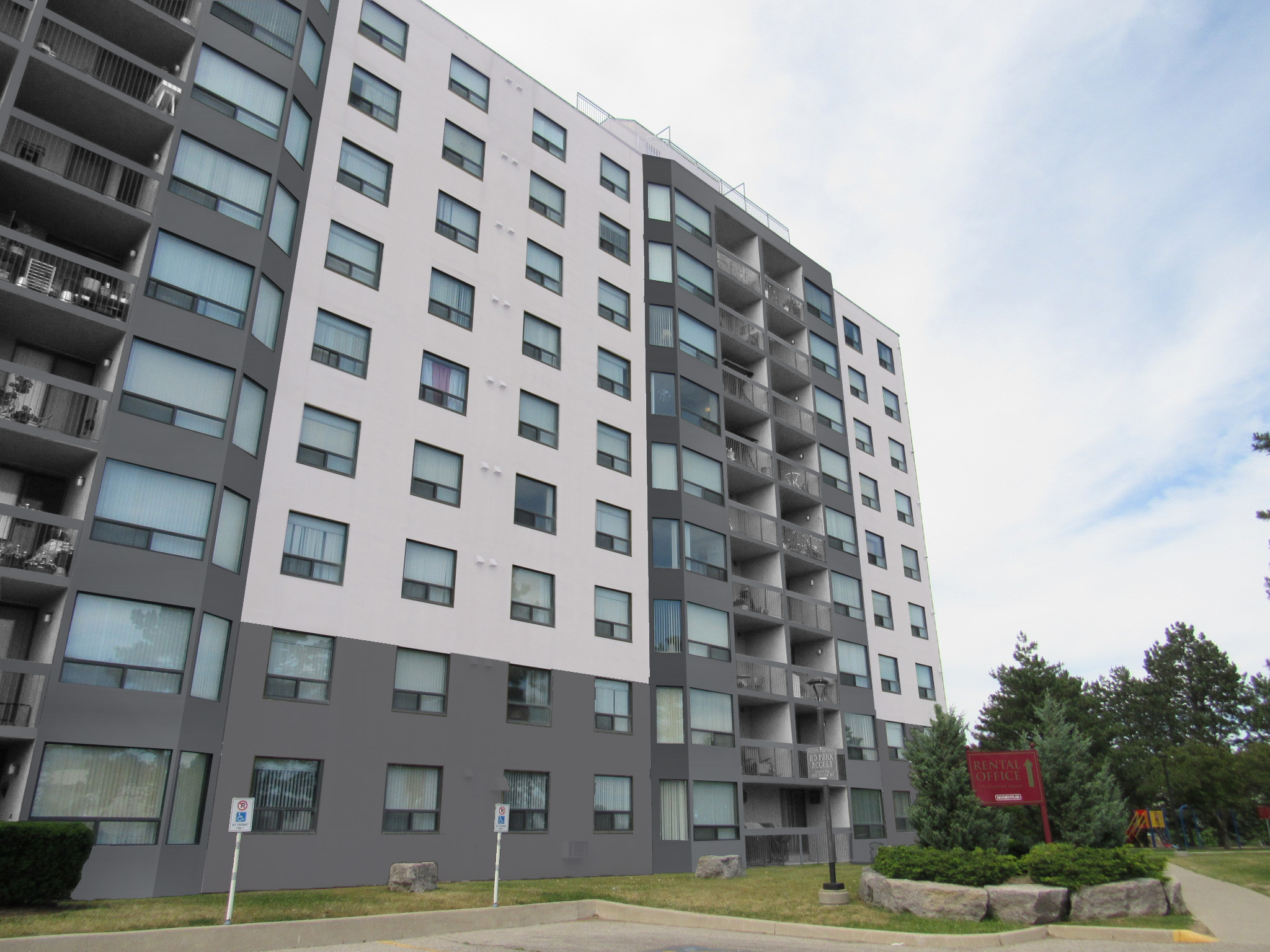 Solution: A large-scale building enclosure restoration was undertaken, involving window and sliding door replacement, guardrail replacement, concrete balcony repairs, balcony waterproofing, sealant replacement, through-wall repairs to corroded studs, removal of localized window walls with new stud wall assemblies with punched windows, EIFS overcladding, and new metal flashings. The scope of the project focused on improving both the building's performance, resilience, and aesthetics, while minimizing disruption to residents. One innovative aspect was the reconfiguration of the bay windows. The original window wall assemblies were removed and replaced with new stud walls complete with EIFS and punched windows, all in the course of a single workday. This minimized disruption, allowing residents to reenter their units the same day. The change not only increased the structural stability of the wall assembly but also significantly improved the thermal performance of the building. To manage water, new sealant diverters were installed at the balconies to direct water away from the adjacent EIFS that protruded beyond the slab edge. Additionally, metal flashing and sloped diverters were introduced to shed water off the building efficiently, reducing moisture exposure to the EIFS and limiting long-term deterioration risks. The new EIFS overcladding provided multiple benefits: enhanced thermal performance, improved air-tightness, reduced water infiltration, and superior soundproofing. By improving the building's insulation, heating and cooling demands were reduced, contributing to energy savings and a more comfortable living environment. The overcladding also refreshed the building's appearance, giving it a modernized look that aligned with current architectural trends. The EIFS at ground floor and tenant accessible areas were reinforced with additional heavy mesh which allowed for a more durable cladding at these locations. Throughout the project, rigorous commissioning and testing were performed to ensure the implemented solutions met performance expectations. Water penetration tests, air leakage tests were completed at windows. Thermal imaging was conducted from the exterior and interior to flag any sources of drafts and to improve the buildings energy efficiency. While the final solution largely adhered to the original design, some adjustments were made based on field conditions. For example, unforeseen corrosion in some structural areas required additional reinforcement, and uncovering live electrical buried in the window walls that were being replaced. These real-time adaptations ensured that the implemented solution was both durable and efficient. Overall, the project combined state-of-the-art materials with thoughtful design and value engineering to deliver a solution that addressed both the building's technical challenges and the aesthetic needs of the client. The improvements in energy efficiency, water management, and building aesthetics represent a notable achievement in building enclosure restoration.