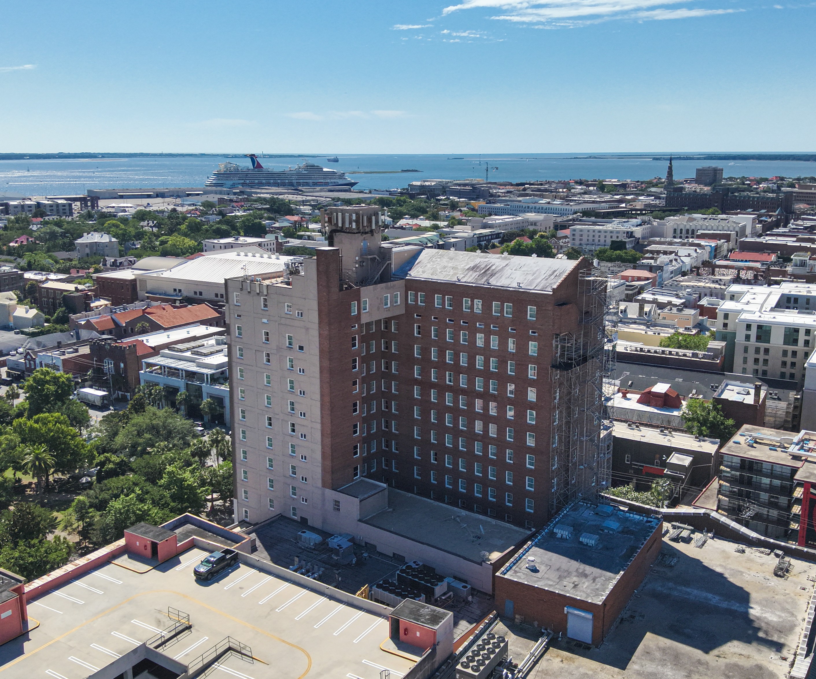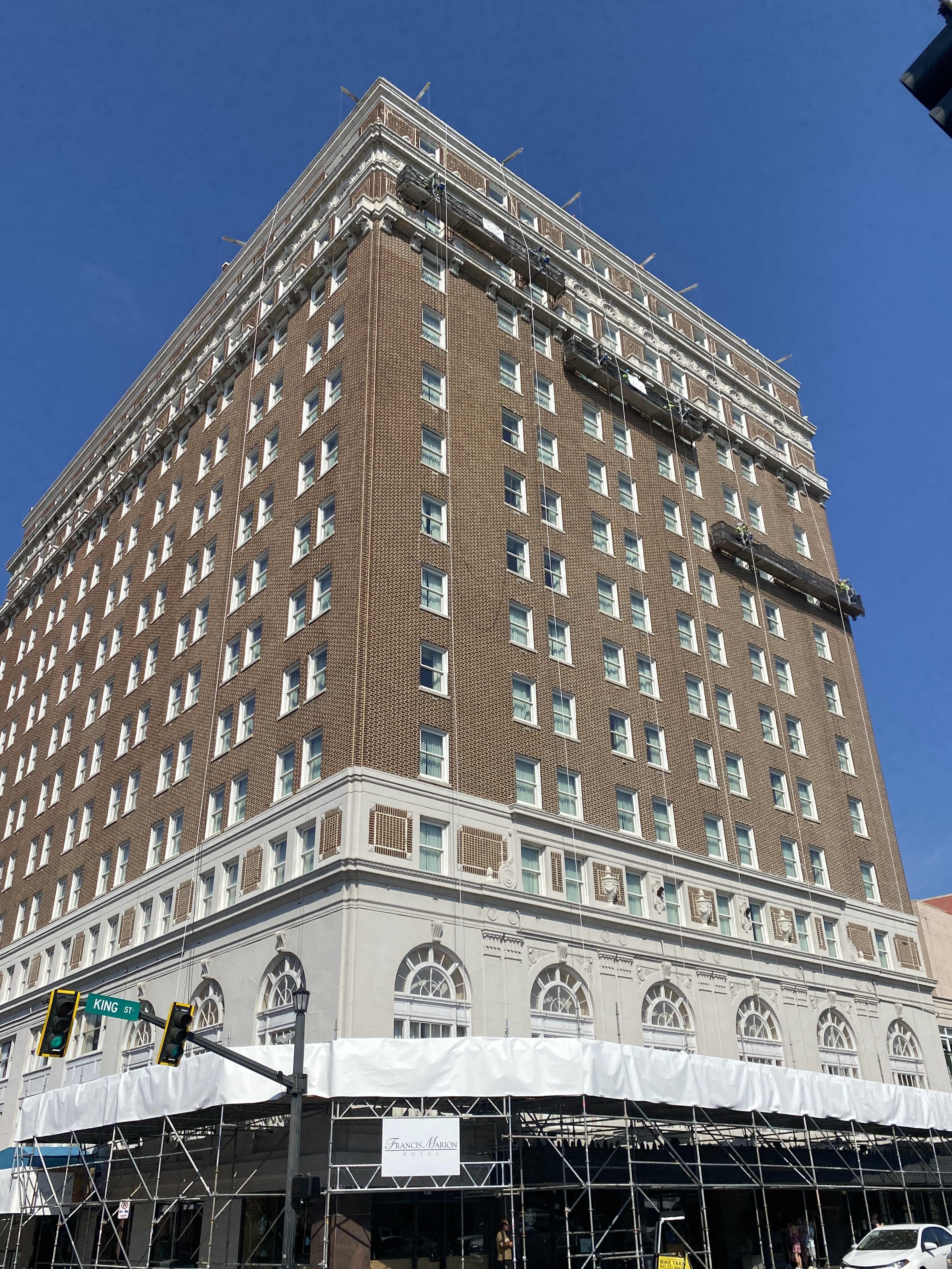 Scope: In 2020, due to various issues such as water intrusion, visual wearing, and deterioration, the ownership initiated a comprehensive assessment of the building envelope and structure. The design and scope generation for the restoration required extensive historical research on the construction and engineering of the building, existing material petrographic analysis, compressive strength analysis, and mathematical engineering — all geared to the standards of the ICRI, the 2016 building code, and the City of Charleston. Standing over 180 feet above Charleston's streets, the hotel presented unique challenges from the very beginning. Traditional inspection methods wouldn't suffice for a structure of this magnitude and historical significance. The team turned to cutting-edge drone technology, combining it with meticulous historical research, public records, observations from the Historic Charleston Foundation, and countless hours of watching the building during rain events to understand exactly how water was finding its way inside. The investigation revealed a building that had many architectural changes over the decades. During the 1930s, when the 12th floor was transformed from a dance hall into hotel rooms, engineers had added a cantilevered stairwell connecting the 11th and 12th floors — an architectural afterthought that would later become one of the project's greatest challenges. This project can be divided into 4 primary phases, each with its own inspection, evaluation, scope generation process, access, and restoration process. The restoration began with the King Street elevation, where the team initially relied on drone technology, binoculars, and keen observation to assess the scale of problems with the brick veneer and ornamental terracotta features. The preliminary analysis suggested that water intrusion was primarily caused by deteriorated skyward-facing mortar joints in the terracotta, organic growth promoting further water penetration, and failing window perimeter sealants. However, as with many restoration projects involving century-old buildings, direct access revealed surprises. When four swing stages were deployed to reach the affected areas, the scope expanded dramatically. The team discovered corroded window lintels beyond acceptable tolerances, rotted wood windows, and unsound brick and terracotta masonry units that hadn't been visible from the ground level. The breakthrough came at the 10th floor windows, located directly beneath the building's largest terracotta outcrop features. Here, the corroded lintels told a story of water intrusion that had been building for decades. All water infiltration from above was funneling to this critical water table, where it either pooled and contributed to lintel corrosion or found its way into the building through 10th-floor ceilings. With the root cause identified, the team implemented a comprehensive solution: organic growth removal, mass brick repointing, brick replacement, stitch tie installation, terracotta unit repairs, glazing, mortar joint replacement, lintel replacement, through-wall flashing installation, and the application of a complete masonry water-repellent system. The most challenging aspect was accessing a beam that hung precariously over the building's back inside corner. This required constructing a complex scaffold and swing stage system that pushed the boundaries of safe access engineering—a testament to the ingenuity required when working with historic structures that weren't designed with modern maintenance in mind.