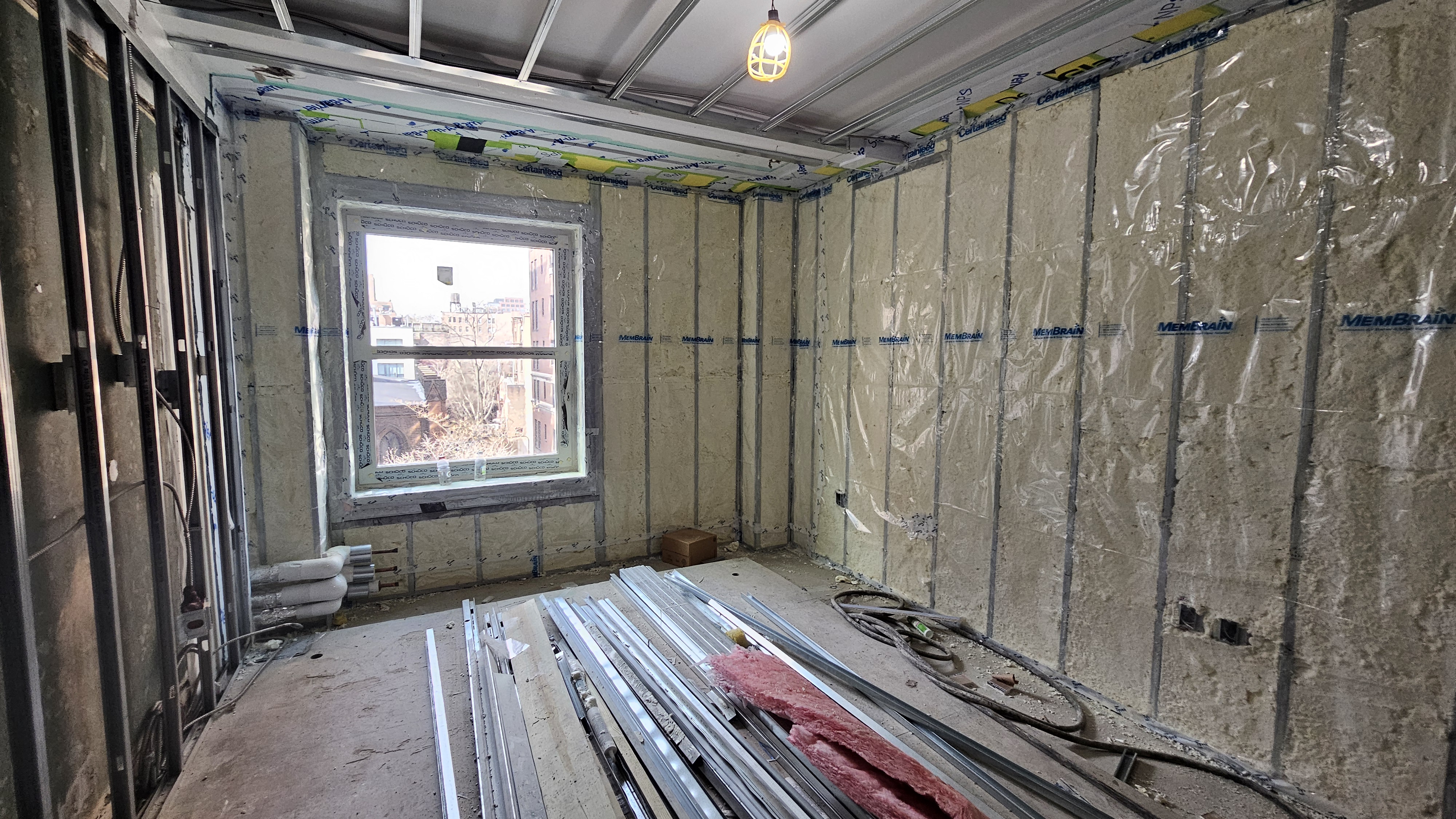 Scope: FXC engaged SGH to provide comprehensive building enclosure consulting services, with a scope that extended from a feasibility study and existing conditions investigation through detailed design and construction administration services. Given the building’s age, incomplete existing building drawings, and complexity of existing conditions, it was critical to perform a condition assessment of the existing building with multiple probe openings through the walls and roofs. SGH documented existing enclosure assemblies, assessed thermal and moisture performance risks, and explored various design options to evaluate the best path toward EnerPHit certification. During the design phase, NYU allowed the design team to mockup a single dorm room using the proposed insulation and air barrier details. SGH worked with FXC to develop details and then conducted blower door testing on the room both before and after installation. The process provided the design team with information that we used to modify certain aspects of the details. The contractor responsible for constructing the mockup room also contributed feedback, which led to alternative approaches that could reduce costs and minimize schedule impacts. A key aspect of the enclosure design was the new windows that were installed in the existing punched openings through mass masonry walls. The design team collaborated with various manufacturers to develop historically appropriate, triple-glazed replacement windows, detailed to satisfy historic preservation requirements while simultaneously meeting stringent airtightness and thermal performance targets. SGH designed comprehensive air and water barrier detailing for rough openings, where historic construction tolerances created alignment and sequencing challenges. SGH performed hygrothermal models of interior insulation strategies to balance energy performance with durability, and to reduce condensation risk at the multi-wythe masonry. Multiple iterations of hygrothermal simulations ensured that the proposed design met EnerPHit performance criteria without jeopardizing the existing wall assembly. Beyond enclosure design, SGH collaborated with the broader design team to remain coordinated on crucial aspects of the design, such as mechanical systems. Airtightness strategies were aligned with ventilation layouts, ensuring that enclosure continuity supported balanced air distribution. Throughout construction, SGH conducted on-site reviews, performed or provided oversight for various field tests, and guided the contractor in implementing complex detailing and performing repairs. Mock-ups were performed to validate window, air barrier and insulation assemblies, allowing for adjustments before full-scale installation. SGH’s involvement ensured that Rubin Hall’s retrofit maintained a clear line of sight between design intent and field execution. The design team’s methodology combined a rigorous diagnosis of existing conditions, iterative design and modeling, and hands-on problem-solving, ultimately enabling a historic high-rise to achieve EnerPHit certification.