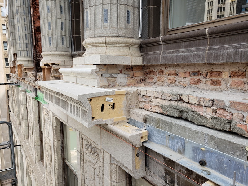 Scope: As stated above, the entire restoration project was performed using a Design-Built method. Sequencing of repair work was performed as follows: WJE performed an initial inspection at each drop to identify specific locations of work based on previously developed unit costs, Central removed units to be replaced or salvaged, repaired, and reinstalled, WJE reviewed existing as-built concealed conditions and modified scope of repair work and repairs as necessary to address the actual conditions, Central cleaned and prepared areas for installation of terra cotta and other repairs, WJE reviewed preparation work and performed periodic inspections as Central implemented repairs, WJE performed a punchlist and final inspection drops to verify repair work had been completed in general accordance with the intent of the contract documents. Scope of repair work included, but not limited to: 100 percent reconstruction of the terra cotta cornice (except at the northwest corner which was previously rebuilt by others), 100 percent reconstruction of the 21st floor terra cotta water table, reconstruction of several terra cotta clad two-story columns between the 21st and 23rd floor levels, 100 percent replacement of previously installed limestone replacement units with new terra cotta units, 100 percent reconstruction of all building corners (between the 5th and 21st floors), Replace cracked, delaminated, and previously spalled terra cotta units throughout the facades, Facade stress relief repair, Face brick replacement and shelf angle repairs. Cleaning and recoating of original steel windows with isolated steel frame repairs Replacement of 2nd floor windows with new steel framed window to match existing historical profiles and site lines.