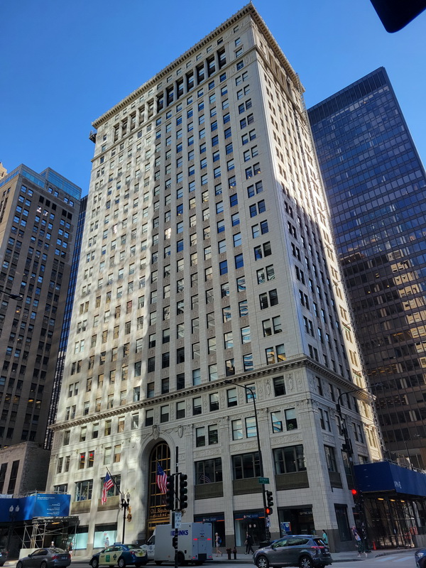 Project Description and Background: Constructed in 1924, the Old Republic Building, located at 307 North Michigan Avenue in Chicago, Illinois, is a 24-story steel frame commercial building clad with terra cotta on the north, west, and south facades and face brick with terra cotta window lintels and sills on the east facade. Designated a Chicago Landmark in 2010, a three-year facade restoration project was completed in 2023. The building Architect (New World Design, Ltd.) retained WJE to perform a limited close-up assessment (via suspended scaffolding and industrial rope access) in 2016 to develop a scope of repair work along with unit costs for a masonry contractor (Central Building & Preservation, L.P. - Central) to provide initial pricing. The repairs were implemented using a Design-Build approach with WJE designating the locations and types of repairs once access to the building facades was provided by Central. Inspections and repair work was performed using mast-climbers on all facades except the east, where swingstages were used. Mast-climbers were well suited for this project because: the main roof contains an operating rooftop restaurant and daily access was prohibited, two facades are located on major public streets (Michigan Avenue and East Wacker Place), one facade on the property line with an adjacent plaza and staircase owned by others, and a lower level alley on the north facade, mast-climbers provided a high-capacity working platform and an area for material staging and storage since space on the site was very limited.