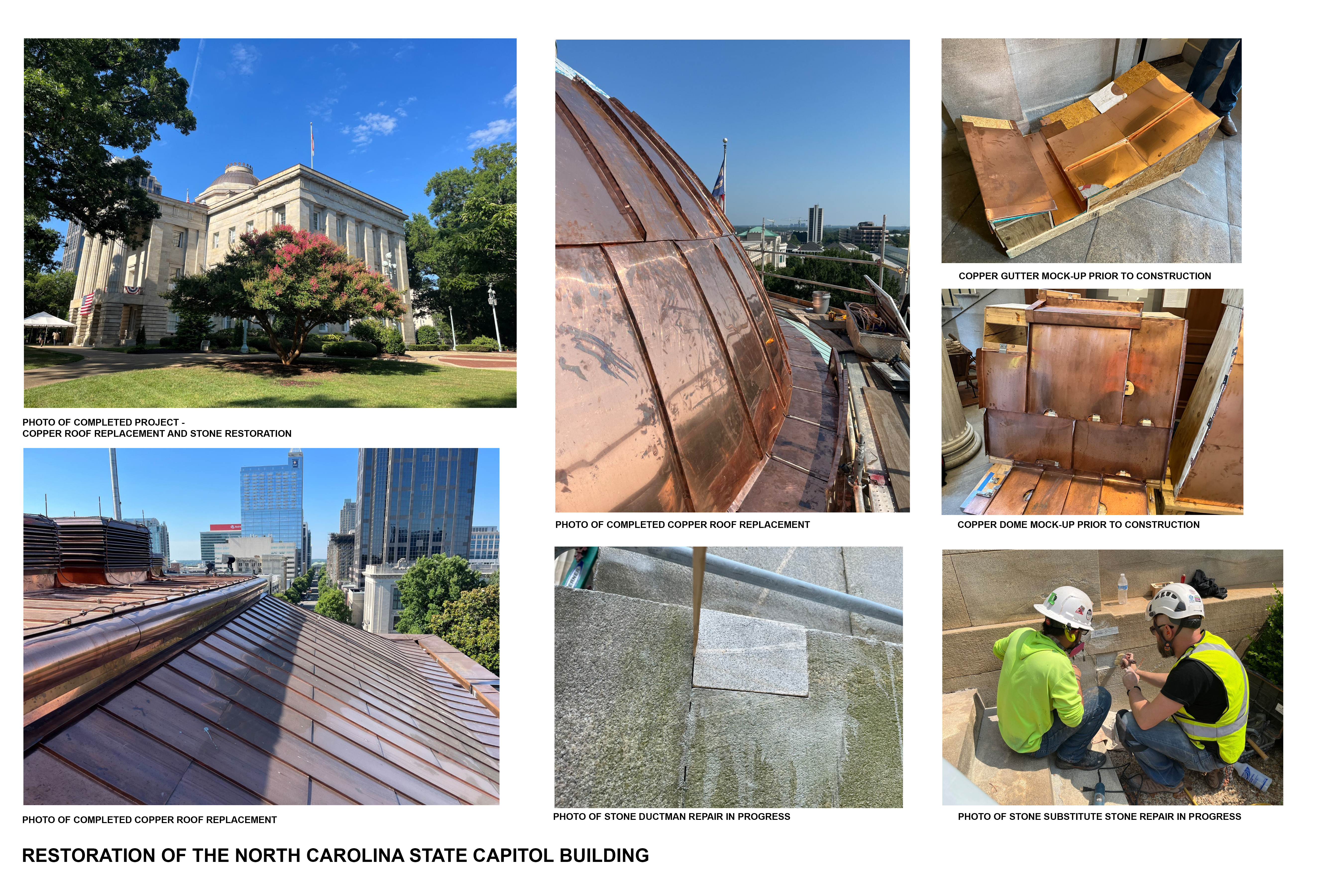 Scope: Prior to design and finalizing the scope Raymond performed a hands-on assessment to allow for a better understanding of the failures of the roof assemblies and stone walls. Due to the historic significance of the North Carolina State Capitol Building, recommendations for design would comply with the Secretary of the Interior’s Standards for Rehabilitation and with the recommended methods and approaches included in the National Parks Service (NPS) Preservation Briefs. Roof: The roof assessment included several test cut locations to observe the copper assembly, installation methods, and determine the extent of any deterioration of the wood decking. The following was concluded: The north and south copper flat roofs and rolled eaves were past their serviceable life and were recommended to be replaced with a new copper roof system designed with expansion joints. Replacing these roofs also required the removal of the rooftop mechanical equipment with the recommendation to permanently move the mechanical equipment inside the attic spaces. In the location of the current rooftop equipment, a low-profile copper clad roof hatch was recommended to be installed to allow for future attic mechanical equipment removal and installation. The hip and gable steep slope roof areas were performing poorly, and the internal gutters were past their serviceable life with several attempts at temporary repairs using liquid waterproofing, it was recommended that the steep slope roof areas and internal gutters were replaced to provide a continuous and contiguous water tight copper roof assembly. The copper clad dome was also showing signs of deterioration and allowing moisture to deteriorate the wood decking, however, due to the steep slope most water was easily shed. The base flashing was past its serviceable life and had received a temporary coating over its joints to reduce water infiltration. It was recommended that the copper dome panels were replaced with the base flashing to allow for a continuous assembly. Stone Facade: The gneiss stone was performing well considering its age and it was an indication of the high-quality design and construction of the Capitol facade. However, it was recommended that masonry treatments occur soon to prevent further deterioration that will require more invasive repairs, stone loss, and interior water infiltration. The following repairs were recommended, and the locations were identified during a hands-on assessment. All repairs were to follow the National Parks Service Preservation Briefs: 1. Redress of stone to scale off lose pieces. 2. Substitute stone repair 3. Crack injections 4. Dutchman repairs 5. Stone cleaning. 6. Mortar removal and repointing.