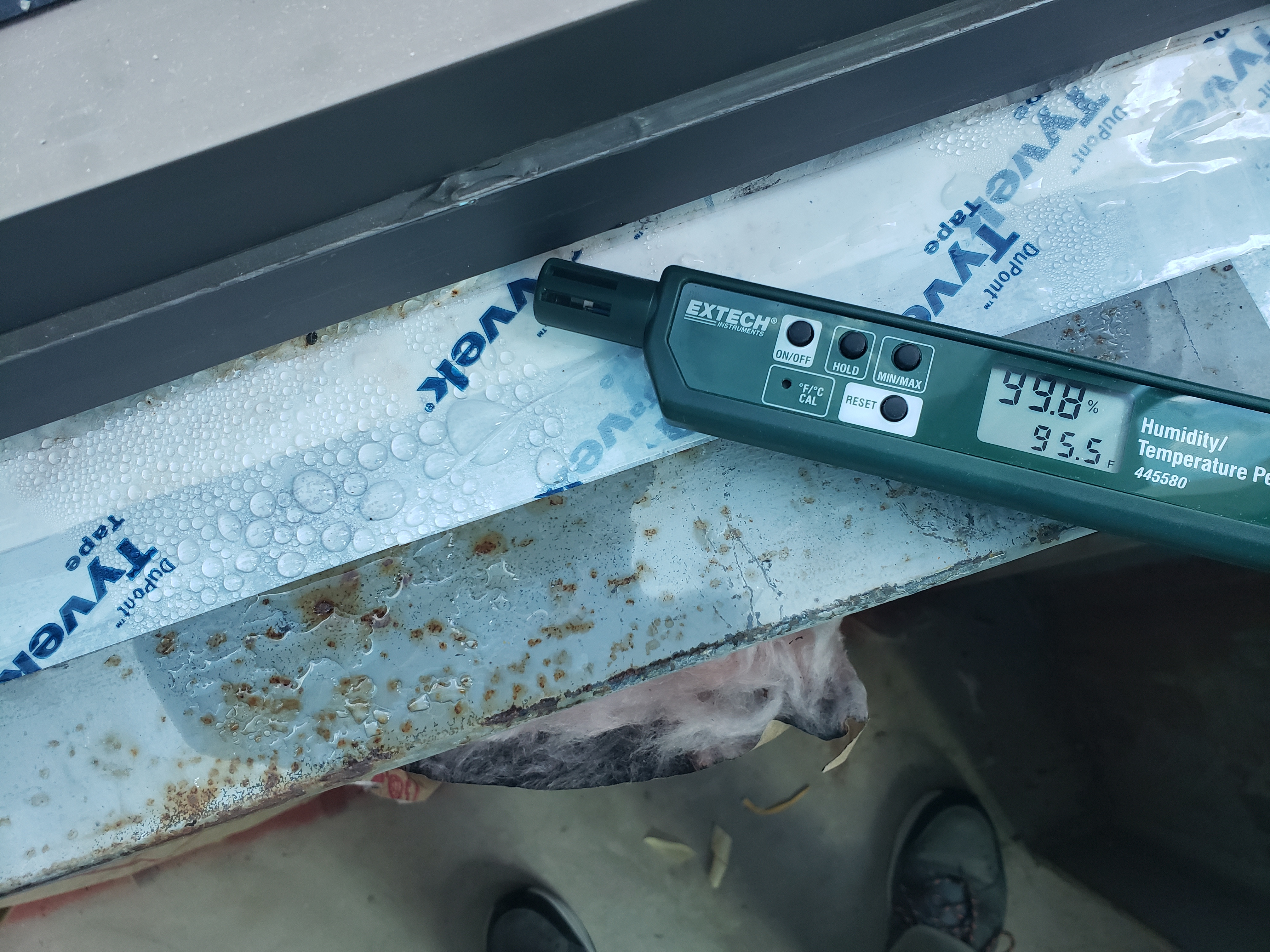 Scope: By performing hose water testing, RosenBEC was able to rule out that the reported problem was the result of water leakage. This initial testing was performed in the fall when the outside weather conditions were cool with a relatively low amount of water vapor in the air. Due to the suspicion of summertime condensation and in anticipation of future testing, RosenBEC took a variety of quantitative measurements during this testing as a baseline comparison (e.g. air temperature, relative humidity, material surface temperatures). While waiting to evaluate the hypothesis of summertime condensation, RosenBEC reviewed the project documents to develop and present conceptual repair options to the owner. It then became apparent that the horizontal strip windows were not installed in conformance with the manufacturer’s installation instructions, which allowed the system to be either interior or exterior glazed. The installed windows were a variation of these options, and when compared to the installation instructions, would be considered either upside down or inside out. The configuration of the windows was then discussed with the manufacturer, but they were not able to provide any commentary or documentation to attest the performance of the as-built configuration. To further compound the issue and hand, the building owner needed to proceed with a repair plan for the 2nd floor because they had signed a new tenant that was preparing to install interior finishes. Once the environmental conditions were conducive to recreating the reported problem, the same exact hose water test procedure was performed at the same location that was previously tested. Although water leakage was not observed (again), shortly after completion of the testing it was apparent that droplets of water were forming above and below the windows. Based on the results from this testing, this was believed to have been a re-creation of the reported problem. The stakeholders proceeded with dispute resolution because they could not agree on who was responsible for the repair costs to rectify the issues at hand. While there was a disagreement with respect to interpretation of the contract documents, RosenBEC’s technical findings and analysis of the reported problem were not brought into question. Although there was not an industry standard or guide for conducting this type of forensic investigation, RosenBEC performed the work in a diligent and objective manner which ultimately provided the necessary information to the project team.