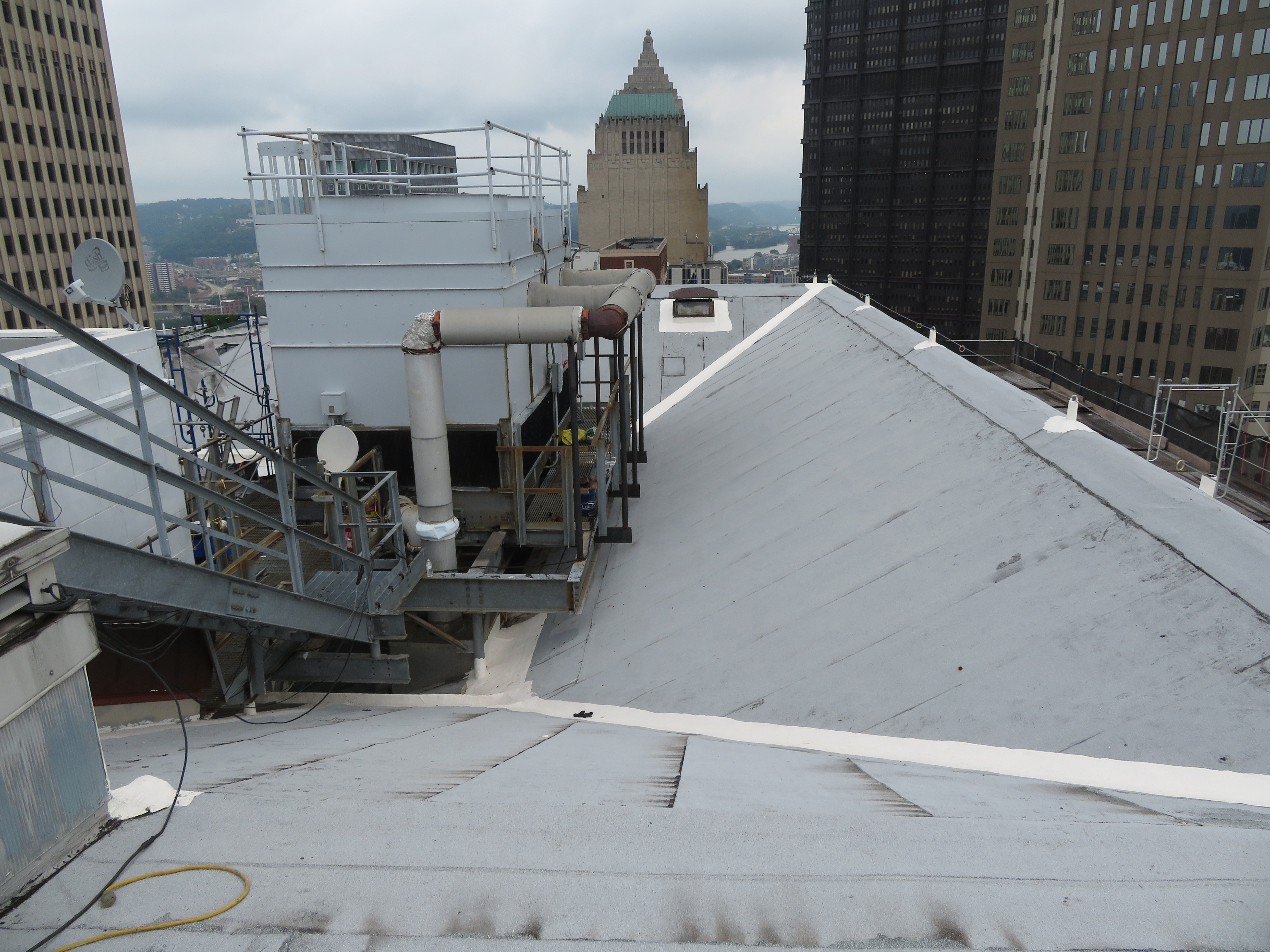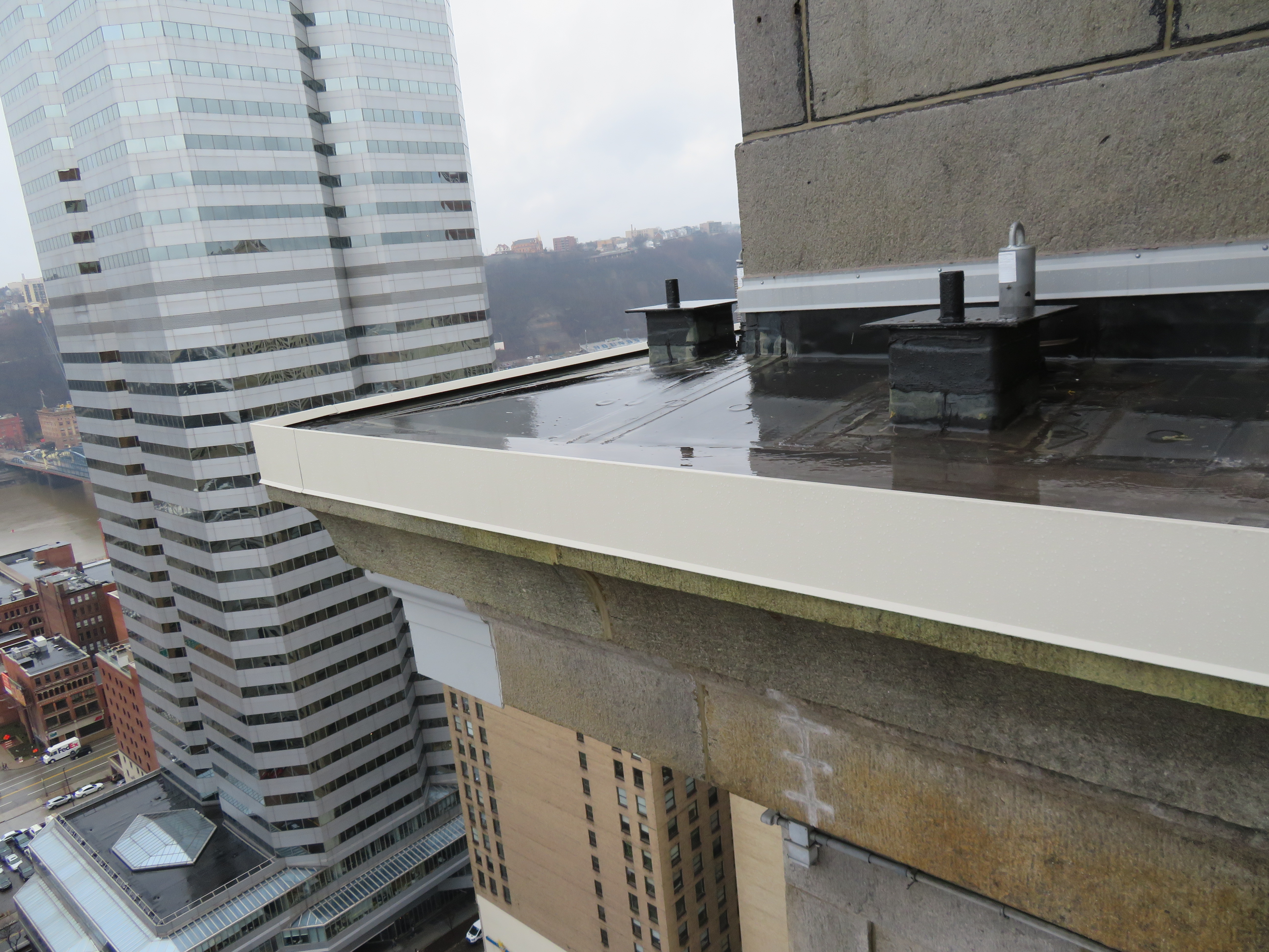 Project Description and Background: Built in 1901 on what was called Grant’s Hill, the Frick building was at the time the tallest building in Pittsburgh. The Frick was the first building in Pittsburgh to have banked elevators, one bank servicing floors 2-11 and another bank servicing floors 11-20. In 1905 a large public works project was undertaken by the City of Pittsburgh to eliminate what they called “the Hump” which was the severe grade change at Grant’s Hill. At this time, the lower story of the Frick which was originally built below grade became the first floor, resulting in a change in the cladding and a revamping of the ground floor to allow what was basement to become the current lobby configuration. The cornice that encircles the building at the 20th floor is original to the building and comprised of solid granite stones and steel framing. Over a 3+ year restoration project that began when a ~1 ton section of granite crashed to the city street 300-feet below BECS was the BEC for the facade, roof, and Building Maintenance Unit (BMU) for The Frick Building. The project began as a causation investigation into the stone cornice failure and evolved into a stabilization, repair, and restoration of the granite building façade; a roof replacement, and finally into the installation of a specialized window washing and façade maintenance system. Challenges encountered included permit department coordination, façade access, antiquated structural systems, budgetary constraints, a site fire, and site logistics. The insurance claim process for this building owner would stretch into a nearly 5 year effort. See attached article for expanded details.