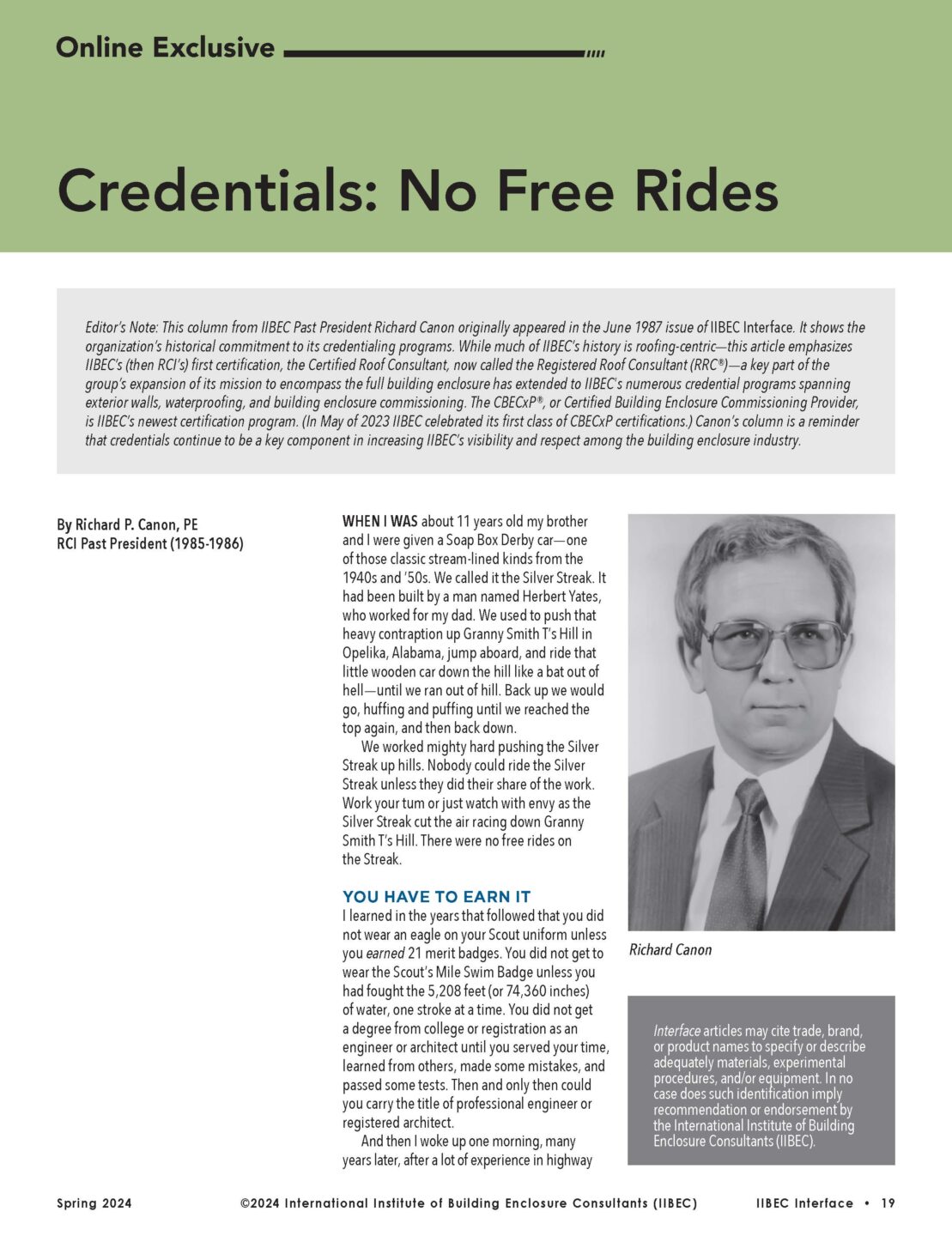 April 30, 2024 WHEN I WAS about 11 years old my brother and I were given a Soap Box Derby car—one of those classic stream-lined kinds from the 1940s and ’50s. We called it the Silver Streak. It had been built by a man named Herbert Yates, who worked for my dad. We used to push that heavy contraption up Granny Smith T’s Hill in Opelika, Alabama, jump aboard, and ride that little wooden car down the hill like a bat out of hell—until we ran out of hill. Back up we would go, huffing and puffing until we reached the top again, and then back down. We worked mighty hard pushing the Silver Streak up hills. Nobody could ride the Silver Streak unless they did their share of the work. Work your tum or just watch with envy as the Silver Streak cut the air racing down Granny Smith T’s Hill. There were no free rides on the Streak. YOU HAVE TO EARN IT I learned in the years that followed that you did not wear an eagle on your Scout uniform unless you earned 21 merit badges. You did not get to wear the Scout’s Mile Swim Badge unless you had fought the 5,208 feet (or 74,360 inches) of water, one stroke at a time. You did not get a degree from college or registration as an engineer or architect until you served your time, learned from others, made some mistakes, and passed some tests. Then and only then could you carry the title of professional engineer or registered architect. And then I woke up one morning, many years later, after a lot of experience in highway Online Exclusive Credentials: No Free Rides By Richard P. Canon, PE RCI Past President (1985-1986) ©2024 International Institute of Building Enclosure Consultants (IIBEC) Interface articles may cite trade, brand, or product names to specify or describe adequately materials, experimental procedures, and/or equipment. In no case does such identification imply recommendation or endorsement by the International Institute of Building Enclosure Consultants (IIBEC). Richard Canon Editor’s Note: This column from IIBEC Past President Richard Canon originally appeared in the June 1987 issue of IIBEC Interface. It shows the organization’s historical commitment to its credentialing programs. While much of IIBEC’s history is roofing-centric—this article emphasizes IIBEC’s (then RCI’s) first certification, the Certified Roof Consultant, now called the Registered Roof Consultant (RRC®)—a key part of the group’s expansion of its mission to encompass the full building enclosure has extended to IIBEC’s numerous credential programs spanning exterior walls, waterproofing, and building enclosure commissioning. The CBECxP®, or Certified Building Enclosure Commissioning Provider, is IIBEC’s newest certification program. (In May of 2023 IIBEC celebrated its first class of CBECxP certifications.) Canon’s column is a reminder that credentials continue to be a key component in increasing IIBEC’s visibility and respect among the building enclosure industry. Spring 2024 IIBEC Interface • 19 program. The first part is documentation of the applicant’s education and/or work experience. This documentation procedure was presented at the 1987 convention for a vote during the annual meeting. All-in-all, we have come a very long way in a relatively brief period of time. We still have years of work ahead of us to implement recognition of the certification program by governmental agencies and in the private sector. But to become a Certified Roof Consultant will require work. Just like riding the Silver Streak, you can only enjoy the pleasure and benefits if you exert personal effort, work, and labor. There will be no free rides to certification, no grandfathering, no giveaways. We need your support in this endeavor. Please be a positive force in helping us to help you. There are enough negative forces out there against us now. You too can make the difference. Become a Certified Roof Consultant. They are the difference. there is no distinction between “one who is” and “one who ain’t.” Which is to say, in the past there was no distinction, but there soon will be! And this, my friends, brings us to the Certified Roof Consultant. From the first meeting of the Roof Consultants Institute (RCI) to this day, a common complaint among bona fide, experienced, and qualified roof consultants has been that there is no distinction between a fast-talking charlatan or crooked snake oil salesman and the legitimate professional roof consultant. What can be done to protect the honest consultant? Where will this profession wind up if something is not done to curb the runaway misuse of the title of roof consultant? I am pleased to report to you that the first examination for certification of roof consultants was administered by RCI at its annual convention in Orlando, Florida, on March 23, 1987. To recap the procedure, only Qualified Professional and Industry Members may sit for the closed-book exam. This examination is the second part of a two-part certification construction, the military service, and structural engineering and found that my new job title was not downhill racer, Eagle Scout, mile swimmer, college graduate, or structural engineer. I was a roof consultant! This new title—roof consultant—did not always represent what one would call an elite group. We were a mixture of “ex”es: ex-roof material salesmen; ex-roof material distributors; ex-construction specifiers; ex-structural, mechanical, chemical, electrical, and industrial engineers; ex-architects; and dozens of other varieties. We also had a group of “still are but gonna diversify”ers and a final group who represented what I’ll call “sigmas,” a Greek word sometimes meaning “the summation,” or in Latin, “et al.,” meaning “and everybody else who wants in on the action.” THE CERTIFIED ROOF CONSULTANT The problem with all of this is that although there is a profession called roof consulting, 20 • IIBEC Interface Spring 2024 Are you a member and want to keep rea