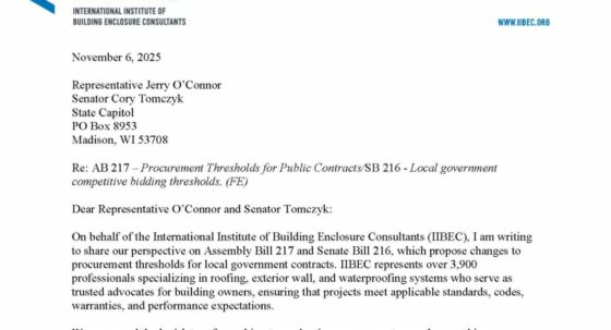 IIBEC Advocates for Protecting Qualifications-Based Selection in Wisconsin November 13, 2025 IIBEC sent a letter on November 6, 2025, to the leading proponents of Wisconsin’s Assembly Bill 217 and Senate Bill 216, Rep. Jerry O’Connor and Sen. Cory Tomczyk, sharing the organization’s perspective on this legislation. While IIBEC supports efforts to modernize procurement procedures and improve efficiency for local governments, the organization expressed concern that raising procurement thresholds without explicitly exempting professional design services could unintentionally weaken Wisconsin’s long-standing commitment to qualifications-based selection. Government Relations