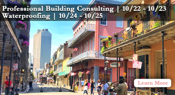 New Orleans, LA Education | October 22-25, 2019 September 30, 2019 Professional Building Consulting 10/22 – 10/23 Waterproofing 10/24 – 10/25 Professional Building Consulting October 22-23, 2019 | 8:00 AM – 5:00 P.M. Join the Facebook event after… General Interest
