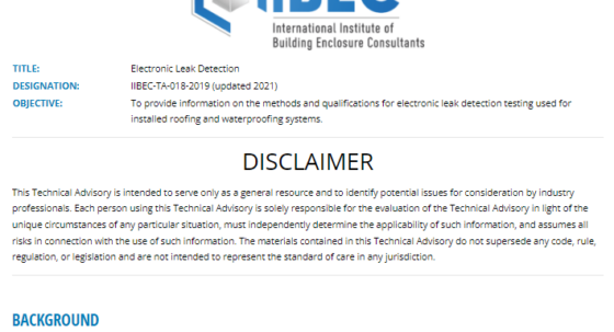 IIBEC Technical Advisory No. 018-2019 (updated 2021) Electronic Leak Detection May 15, 2019 With the desire to improve the service life of roofing and waterproofing systems, a need has arisen to improve both quality control (QC) and trouble-shooting techniques of these systems. The introduction of nondestructive electronic leak detection (ELD) testing has provided additional options to meet this demand. Since QC is an increasingly important aspect in today’s construction projects, ELD is becoming a commonly specified and utilized procedure to determine watertightness in roofing and waterproofing assemblies... Codes and Standards