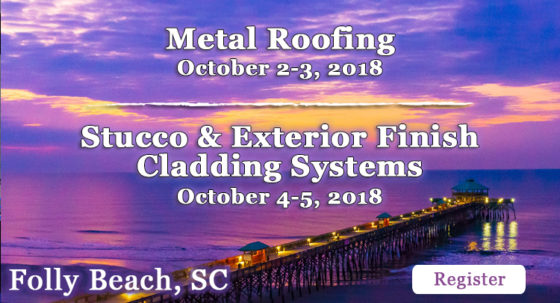 Folly Beach/ Charleston, SC Education Course September 19, 2018 Metal Roofing – 16 RCI Continuing Educational Hours – 16 AIA Learning Units and HSW credit October 2-3 | Register Today Stucco &… General Interest