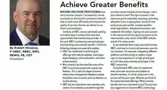 President’s Message: Embracing Technology to Achieve Greater Benefits July 11, 2024 President’s message By Robért Hinojosa, F-IIBEC, RBEC, RRO, REWO, PE, CDT President BUILDING ENCLOSURE PROFESSIONALS are savvy business people. Consequently, we are constantly on the hunt for innovations…