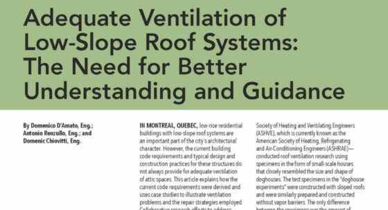Adequate Ventilation of Low-Slope Roof Systems: The Need for Better Understanding and Guidance February 9, 2024 IN MONTREAL, QUEBEC, low-rise residential buildings with low-slope roof systems are an important part of the city’s architectural character. However, the current building code requirements and typical design and construction… Codes and Standards