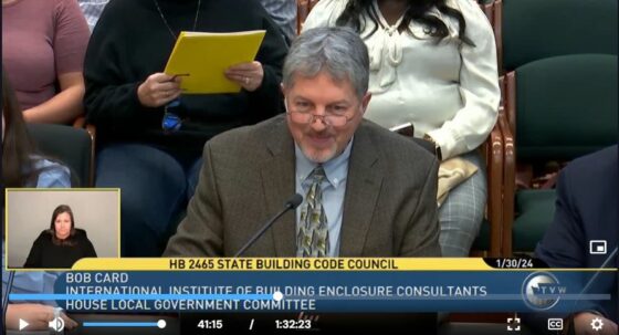 Bob Card Testifies Before Washington State Legislature on Code Council Process Bill February 1, 2024 Bob Card, F-IIBEC, RBEC, RRC, RWC, REWC, REWO, and former IIBEC president, testified January 30, 2024, before a Washington state House committee in support of legislation that would streamline the State Building Code Council’s process for considering new model codes. In mid-January IIBEC identified a pair of fast-moving bills pending before the Washington state legislature—SB 6291 and HR 2465—that would improve how the code council works and therefore increase the probability that the state would update its codes on a regular basis, a policy position IIBEC supports. IIBEC teamed with its Puget Sound Chapter to send a letter endorsing SB 6291 to Washington’s State Government & Elections Committee, which was scheduled to hold a January 26 hearing on the bill. IIBEC Members