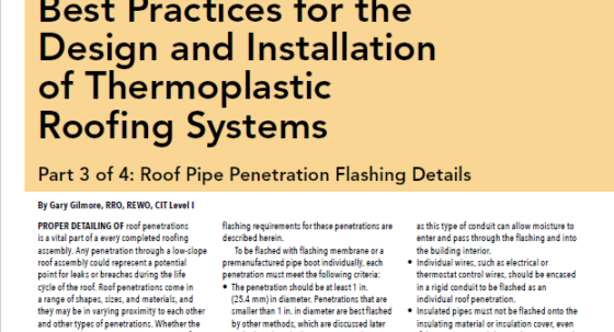 Best Practices for the Design and Installation of Thermoplastic Roofing Systems – Part 3 of 4 June 6, 2023 IIBEC Interface May/June 2023 Best Practices for the Design and Installation of Thermoplastic Roofing Systems Part 3 of 4: Roof Pipe Penetration Flashing Details Feature Interface articles may… Technical Article