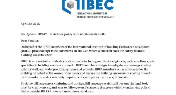 IIBEC Tells Missouri Senate to Vote Down Poorly Written Anti-Building-Code Legislation May 9, 2025 Repeat anti-building-code legislation from 2024 made a surprising amount of progress in 2025 until it hit a wall of bipartisan common sense in the state senate, where it stalled. The state’s legislative session ended before the bill’s proponents could mollify the concerns of the detractors, and the bill died. General Interest